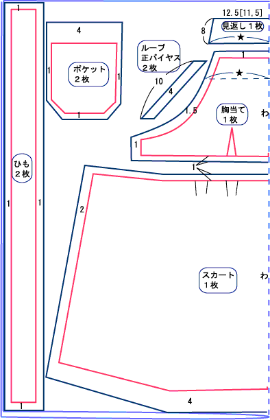 90cm幅の生地の場合は、スカートの裾幅を布幅からひもを取った幅にして(裁ち切りで)、脇で裾を上げるのを1pにします。